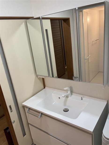 100㎝洗面化粧台と64㎝洗濯機パンを設置して無駄なスペーススがなくッキリしました。