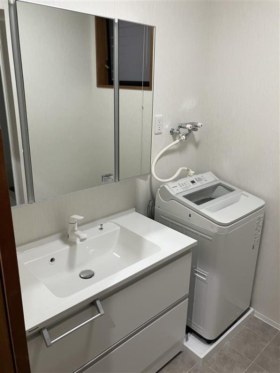 100㎝洗面化粧台と64㎝洗濯機パンを設置して無駄なスペーススがなくッキリしました。