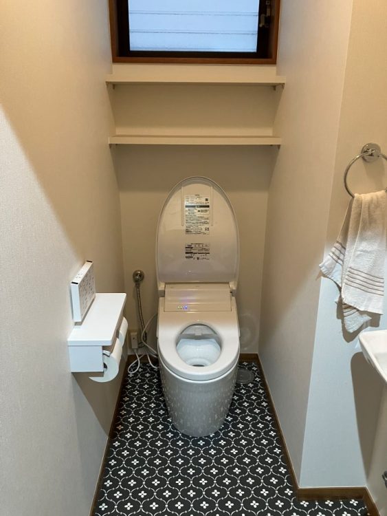 棚板を2段付けて、床材、壁紙貼替、2連紙巻き器と洋便器も取替ました。